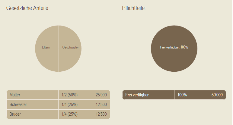 Walter hinterlässt eine liebenswerte Mutter und Schwester, und einen kumpelhaften Bruder. Sein gesamtes Vermögen beläuft sich auf 50‘000. Die Mutter erhält gemäss Gesetz 25‘000 (50%), sein Bruder 12‘500 (25%), und seine Schwester ebenfalls 12‘500 (25%).