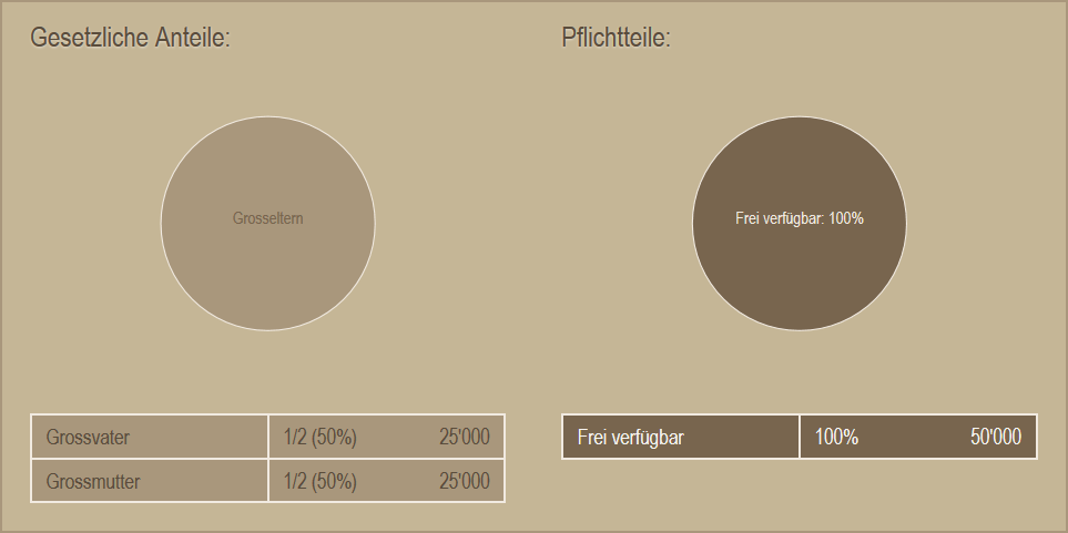 Die Grosseltern erhalten gemäss Gesetz 100 % des Vermögens. Die Grosseltern sind nicht pflichtteilsgeschützt. Somit kann 1/1 (100 %) des Vermögens mittels Testament an eine beliebige Person oder Institution vermacht werden.