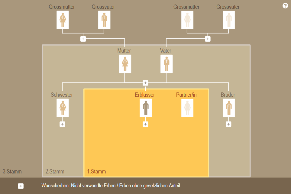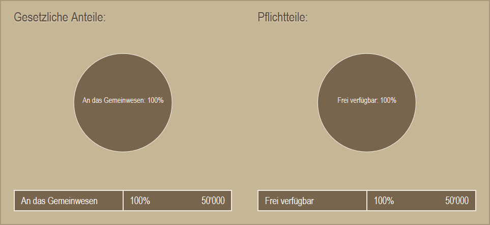 Sofern keine gesetzlichen Erben aus dem ersten, zweiten oder dritten Stamm (Parentel) vorhanden sind, so erbt das Gemeinwesen 100 % des Vermögens. Somit kann 1/1 (100 %) des Vermögens mittels Testament an eine beliebige Person oder Institution vermacht werden.